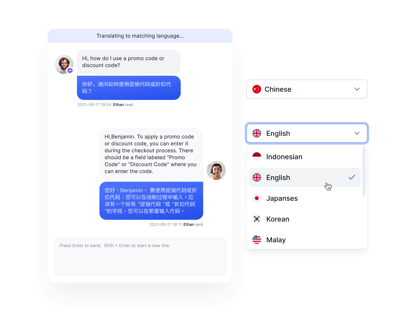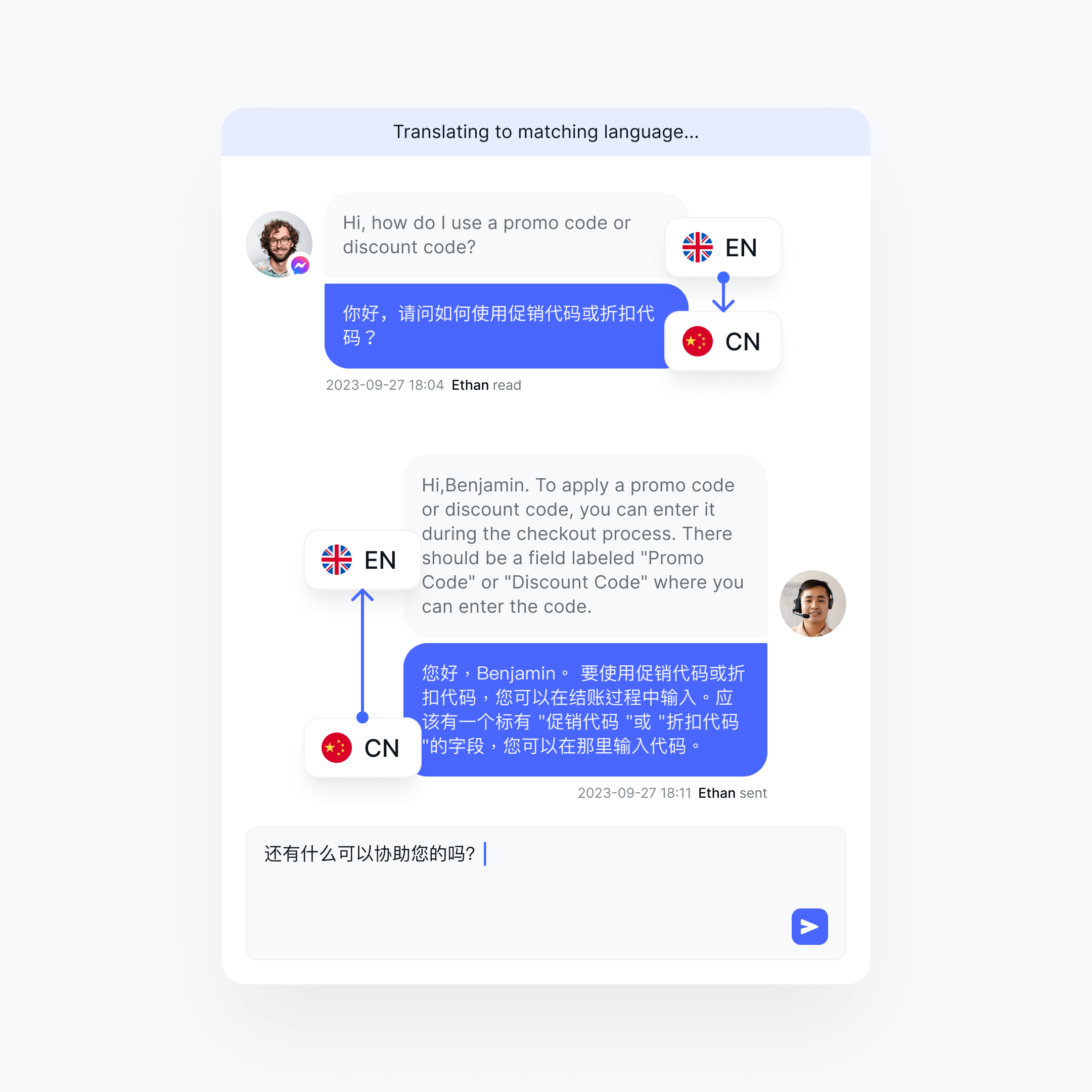 无论客户使用什么语言,您都可以轻松回复。只需在翻译窗口输入您的内容,点击发送,我们会自动为您翻译成客户的语言。